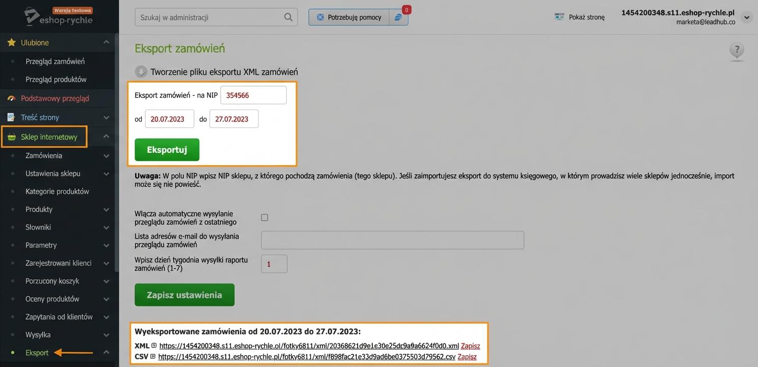 W panelu administracyjnym swojego e-sklepu przejdź do zakładki „E-shop → Eksport → Eksport zamówień“.