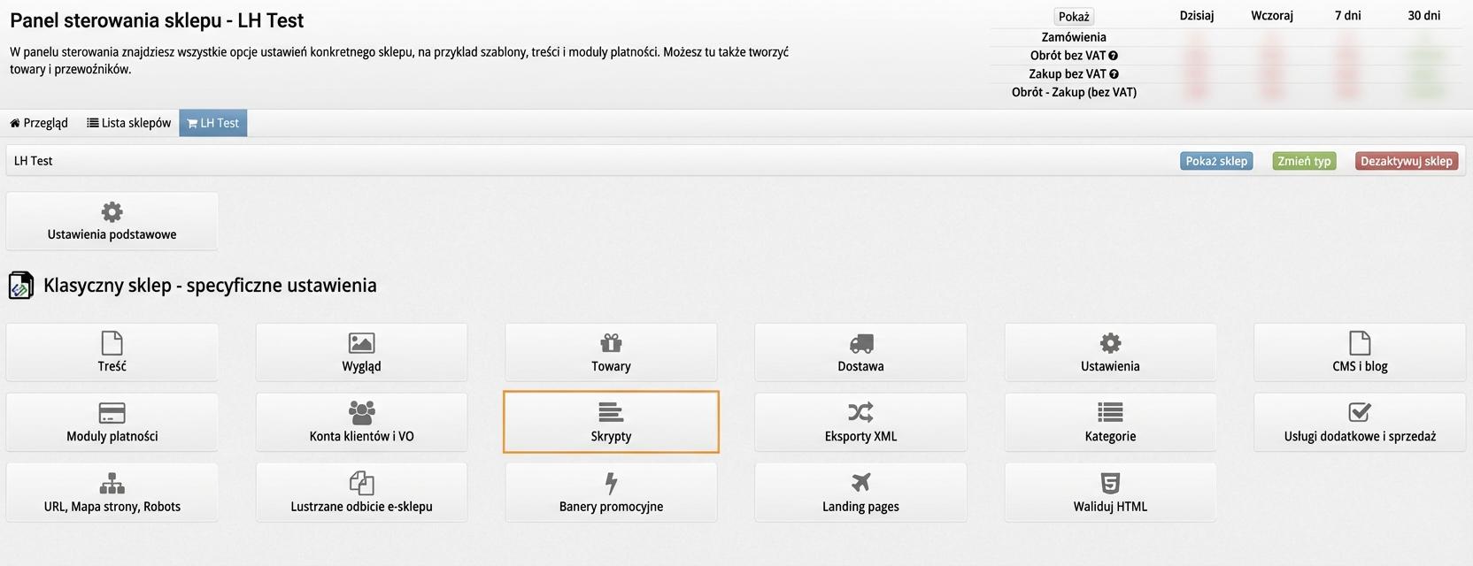 - W panelu sterowania sklepu przejdź do zakładki „Skrypty”.