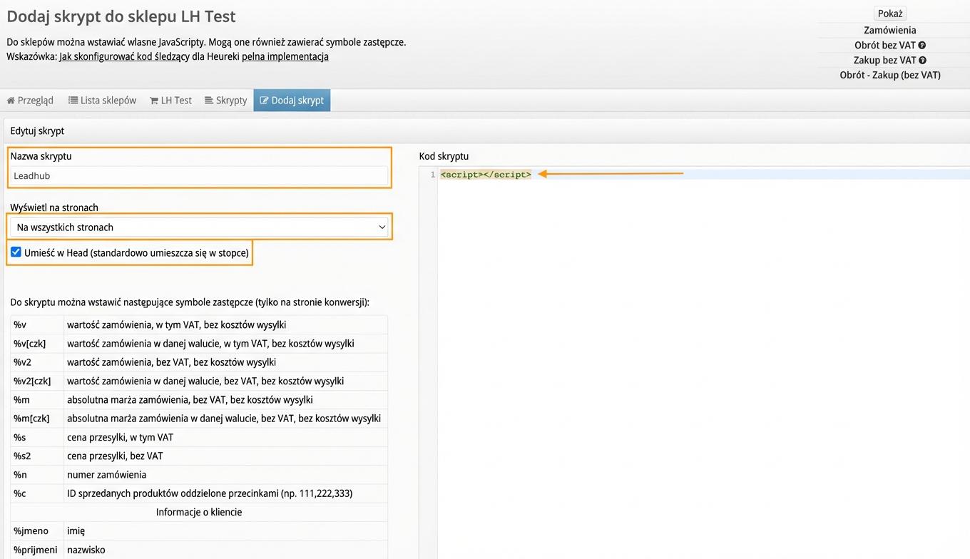 - Na stronie „Dodaj skrypt do sklepu” uzupełnij nazwę skryptu i zaznacz pole „Umieścić w Head” (standardowo umieszcza się w stopce). W polu „Kod skryptu” wklej skrypt z identyfikatorem (tracking id), który znajdziesz w początkowej konfiguracji swojego konta bezpośrednio w Leadhubie.