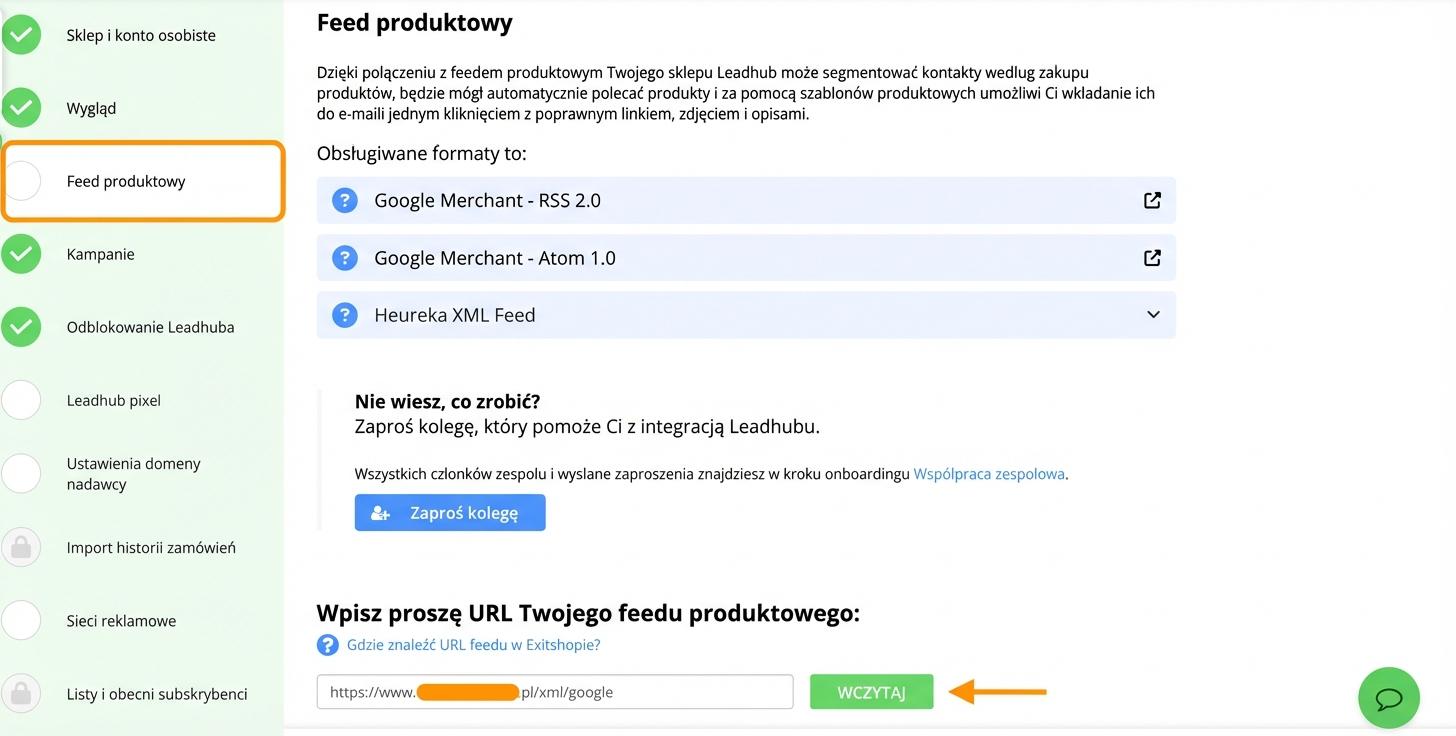Adres URL feedu produktowego zarejestruj w początkowej konfiguracji swojego konta w Leadhubie w zakładce Feed produktowy.