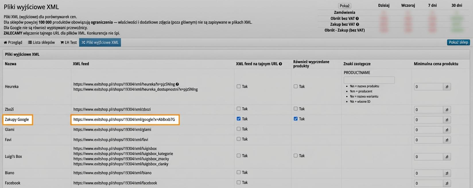 Z listy wyjść wybierz Zakupy Google i skopiuj adres URL feedu w formacie XML.