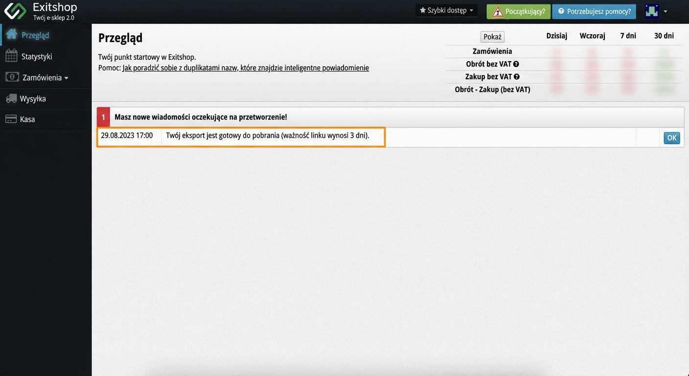 - W zakładce „Przegląd” w ciągu kilku minut pojawi się wiadomość zawierająca link do eksportu zamówień. Kliknij link i skopiuj adres URL eksportu zamówień w formacie XML.