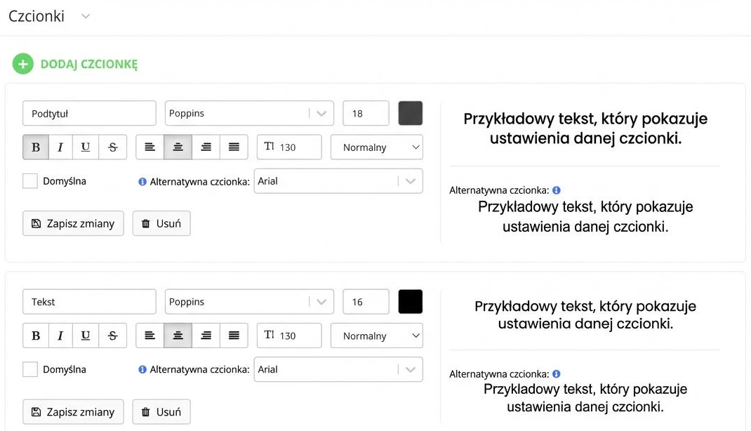 Wystarczy kliknąć "Dodaj czcionkę". Automatycznie utworzy się nowy blok, który możesz nazwać po swojemu dla przejrzystości i łatwej orientacji. Ostyluj font i zapisz zmiany.