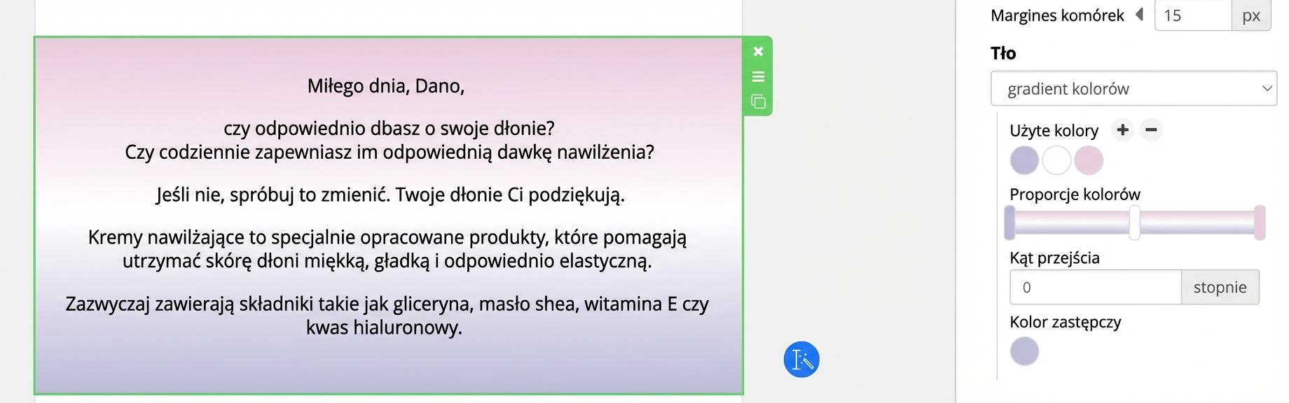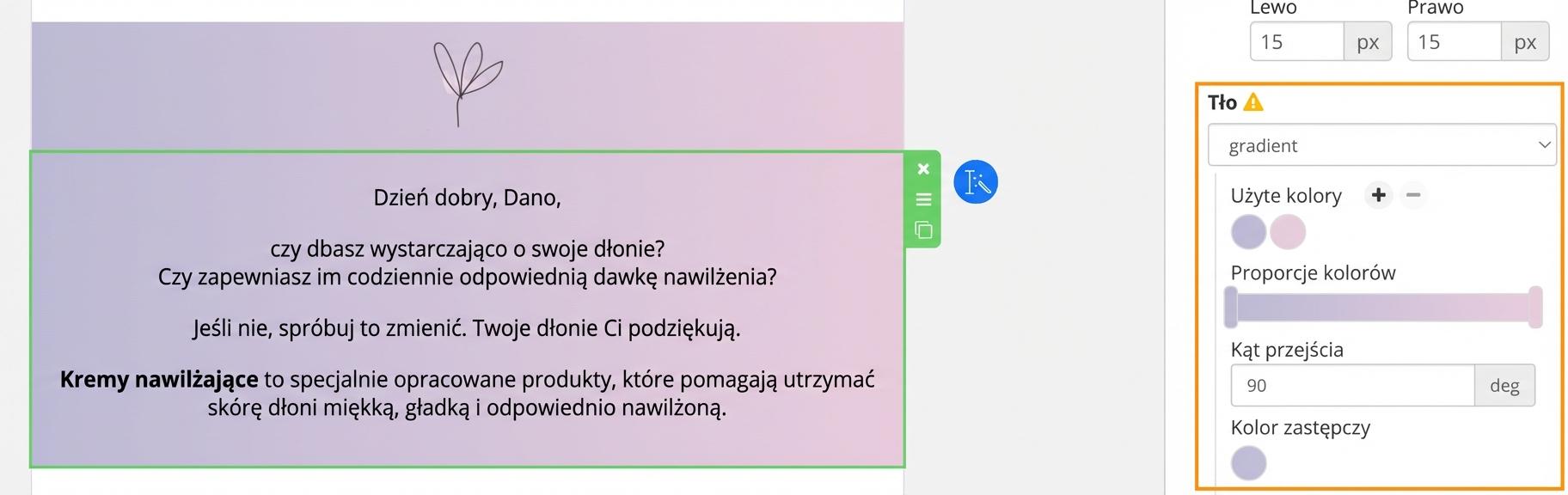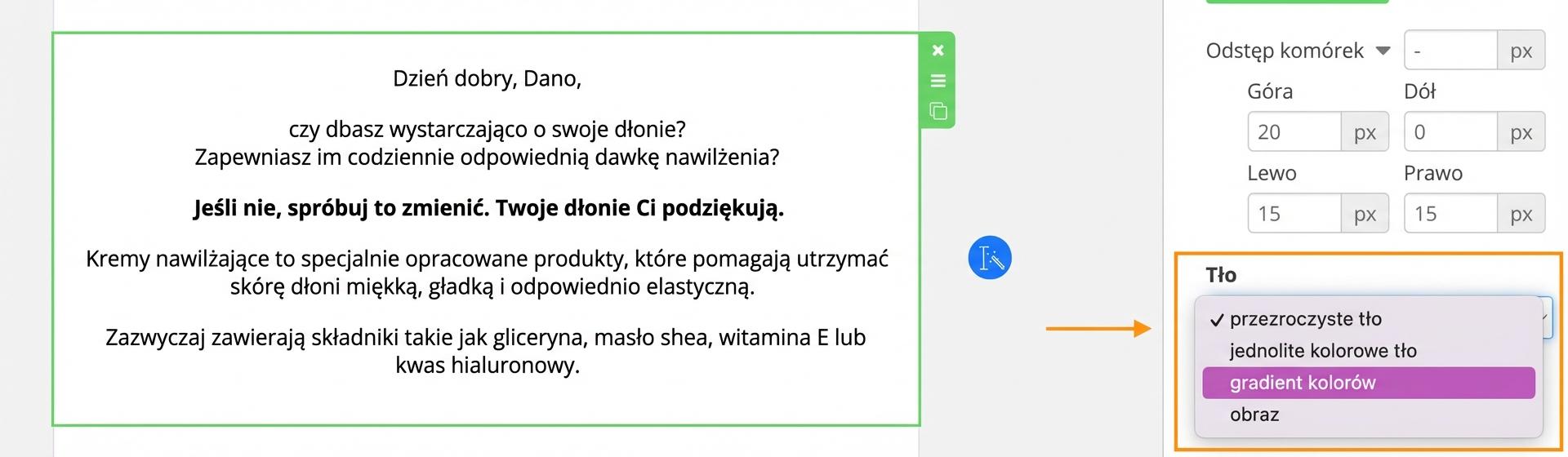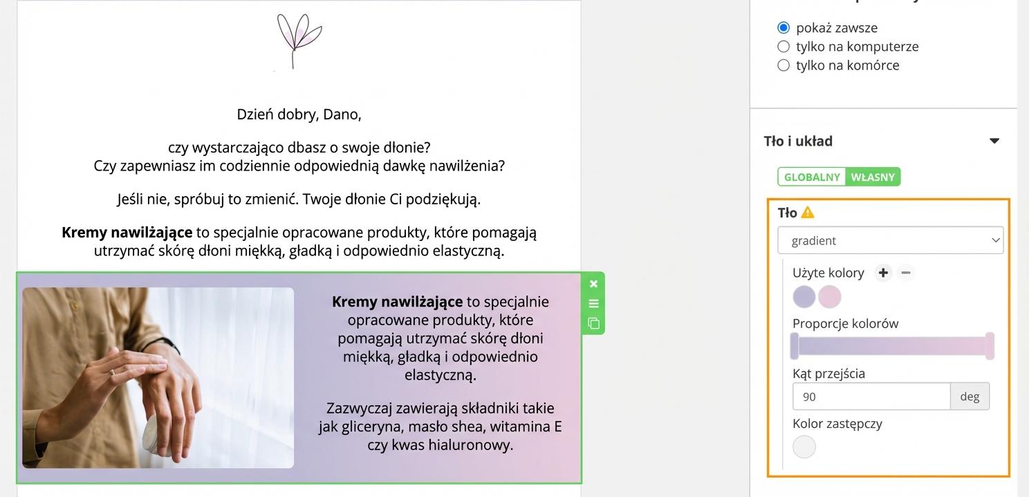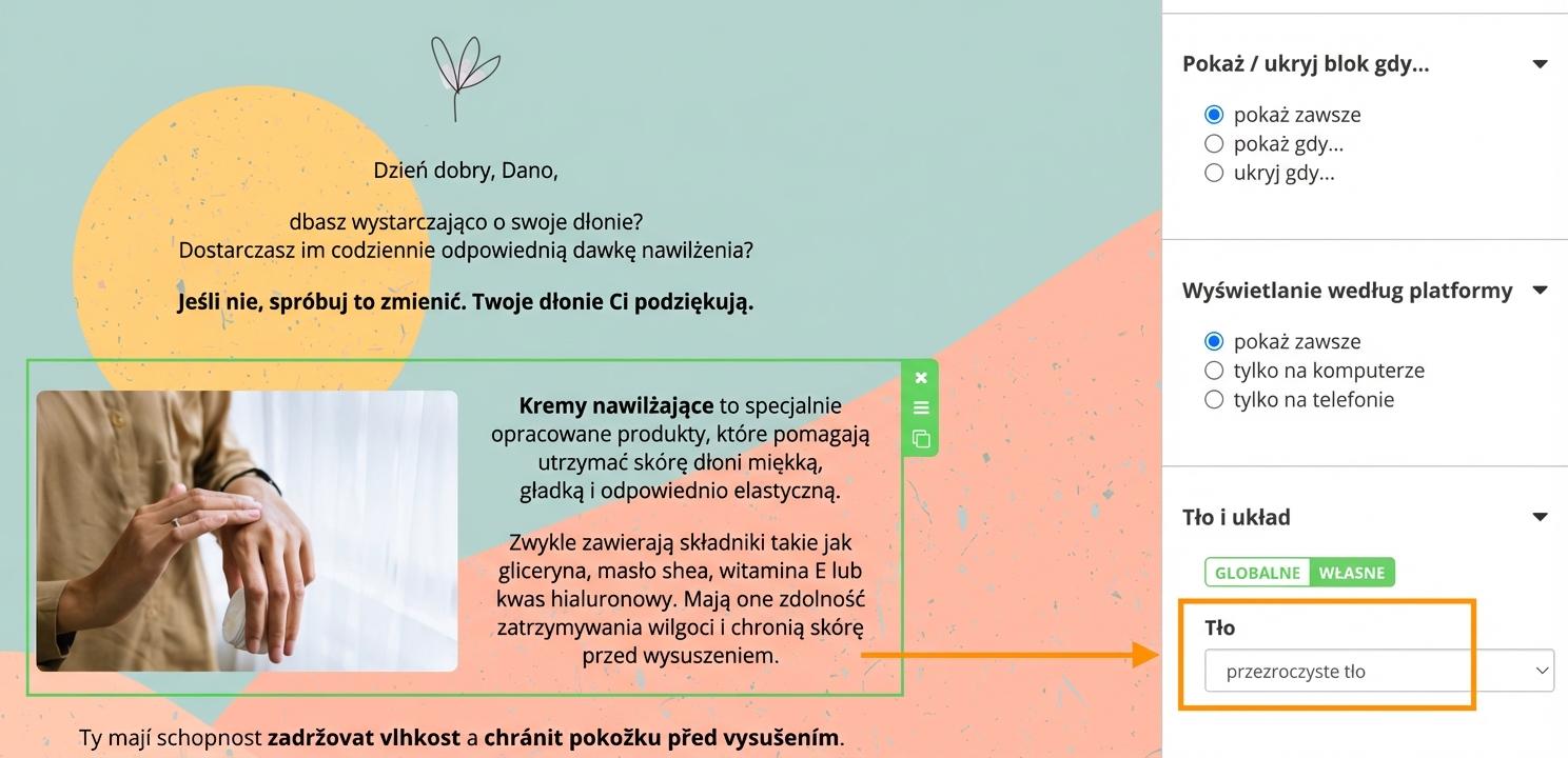 Jeśli ustawisz dla wybranego bloku „przezroczyste tło”, odziedziczy on tło, które ustawiłeś dla całego e-maila. Więcej poniżej.