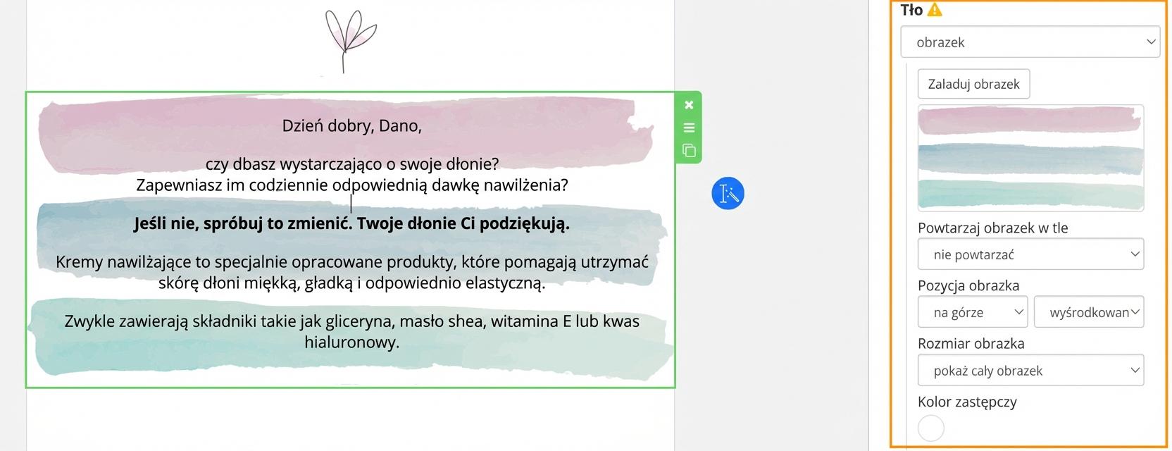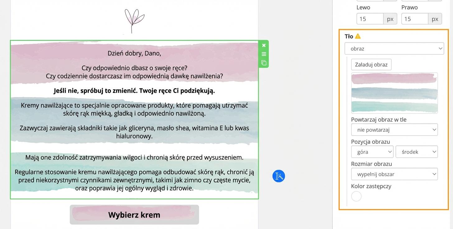 Tak samo jak dla całego e-maila, możesz wstawić dowolne tło również do poszczególnych bloków bezpośrednio w treści e-maila.