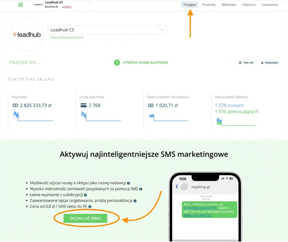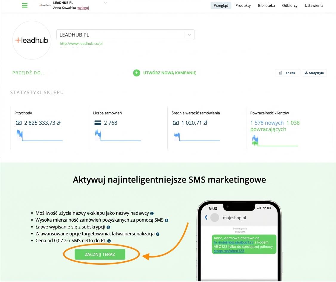 Bezpośrednio w dashboardzie (w przeglądzie kampanii) znajdziesz możliwość aktywacji kampanii SMS. Po kliknięciu przycisku "Zacznij już teraz" zostaniesz automatycznie przekierowany do wstępnej konfiguracji kampanii SMS.