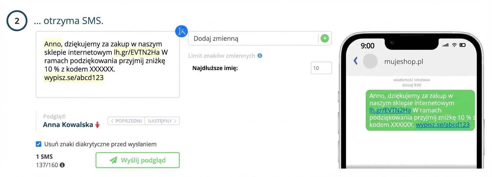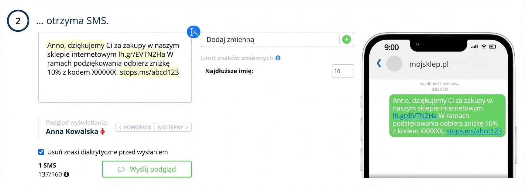 Każda kampania SMS musi zawierać link rezygnacji. Można w nich umieszczać różne zmienne (imię, nazwisko, kod rabatowy, linki..) tak jak w kampaniach e-mailowych.