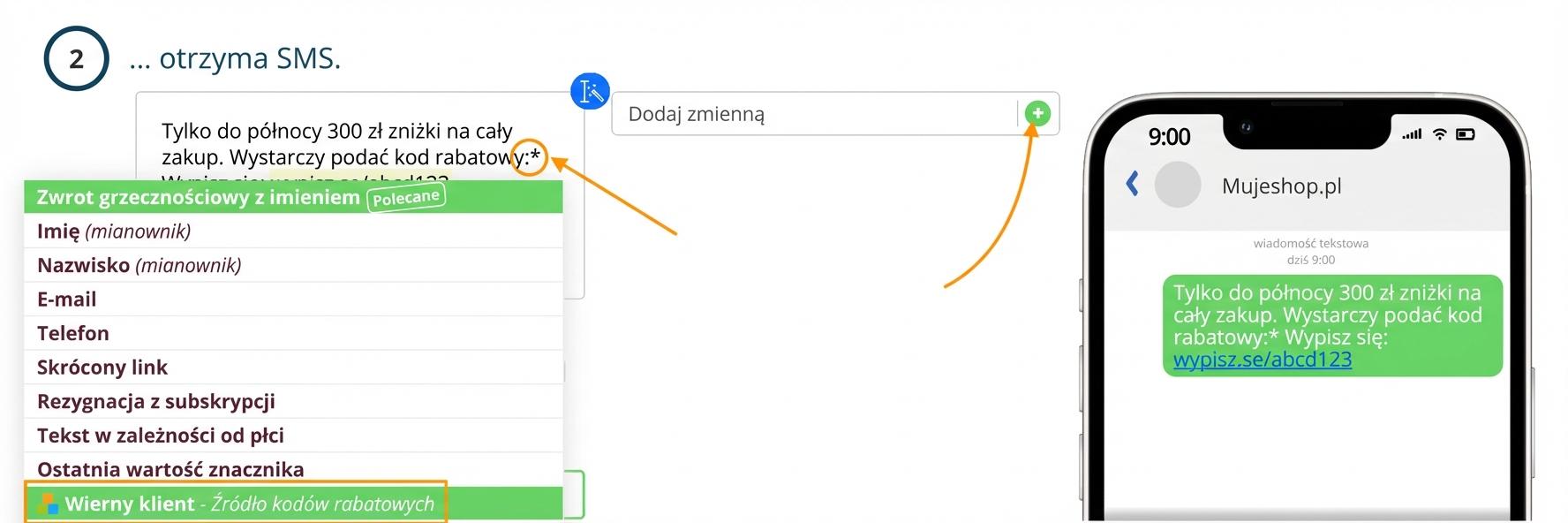 Wpisz w treści kampanii SMS znak gwiazdki "*" lub wybierz po prawej stronie edytora opcję "Dodaj zmienną". Następnie wybierz odpowiednie źródło kodów rabatowych.