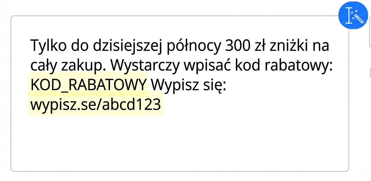 Uniwersalny kod rabatowy – jeden i ten sam kod dla wszystkich odbiorców – wstaw go wyłącznie jako tekst w treści kampanii SMS (np. "VALENTYN20")