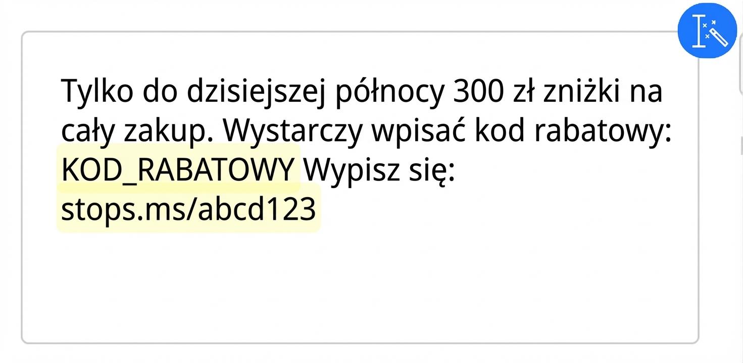 Podobnie jak w kampaniach e-mailowych, możesz wstawić kod rabatowy do kampanii SMS. Zasada działania jest wtedy dokładnie taka sama jak w przypadku kampanii e-mailowych.