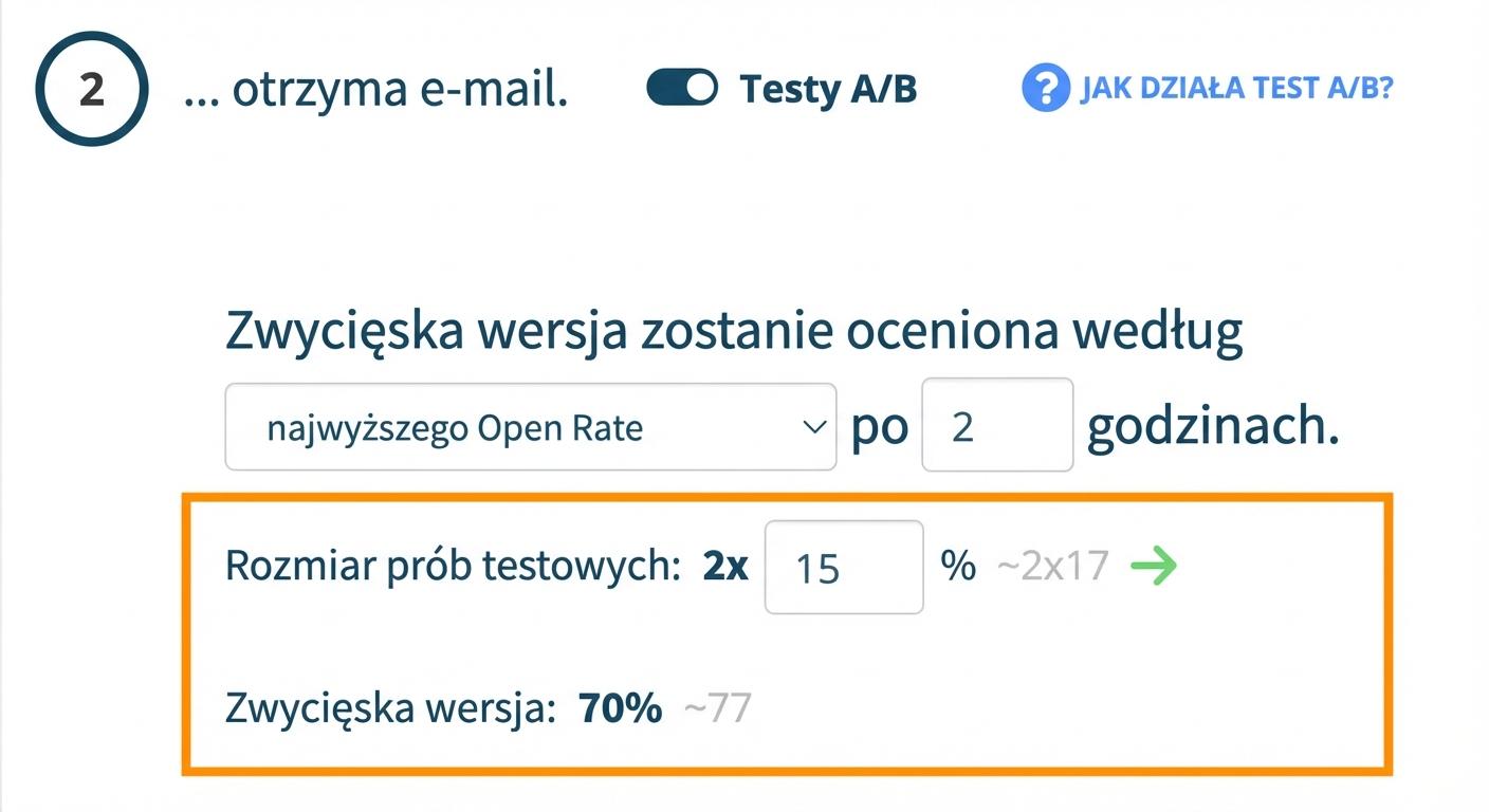 - Wybierz, jak duże będą grupy testowe – np. 15% – czyli wariant A zostanie wysłany do 15% zdefiniowanej grupy odbiorców, i tak samo wariant B zostanie wysłany do kolejnych 15% tej grupy testowej. Tę część odbiorców nasz system wybierze losowo.