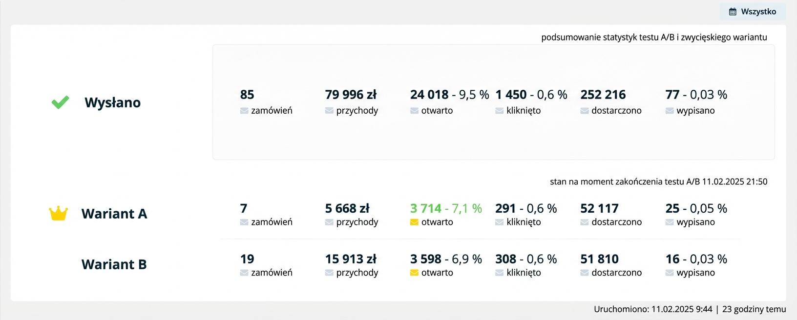 Ustaw, według której metryki i po jakim czasie chcesz ocenić test A/B – np. po 2 godzinach, a główną metryką będzie otwarcie e-maila (open rate) – oznacza to, że wariant, który po 2 godzinach będzie miał wyższy wskaźnik otwarć, będzie zwycięski i zostanie wysłany do pozostałej części odbiorców, czyli do 70% pozostałych subskrybentów (część testowa stanowiła 30%).