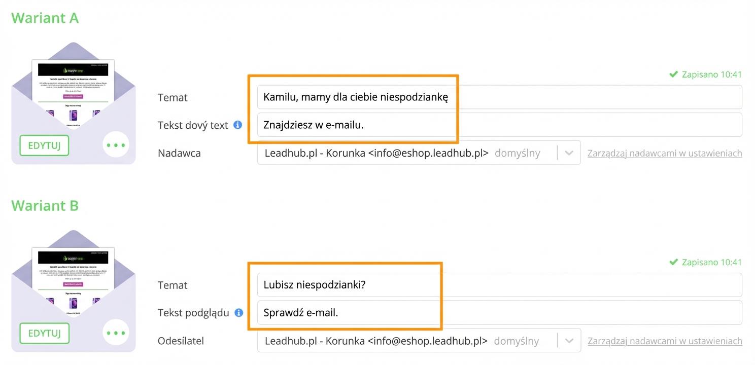 Teraz należy przygotować 2 warianty e-maila – wariant A i wariant B.