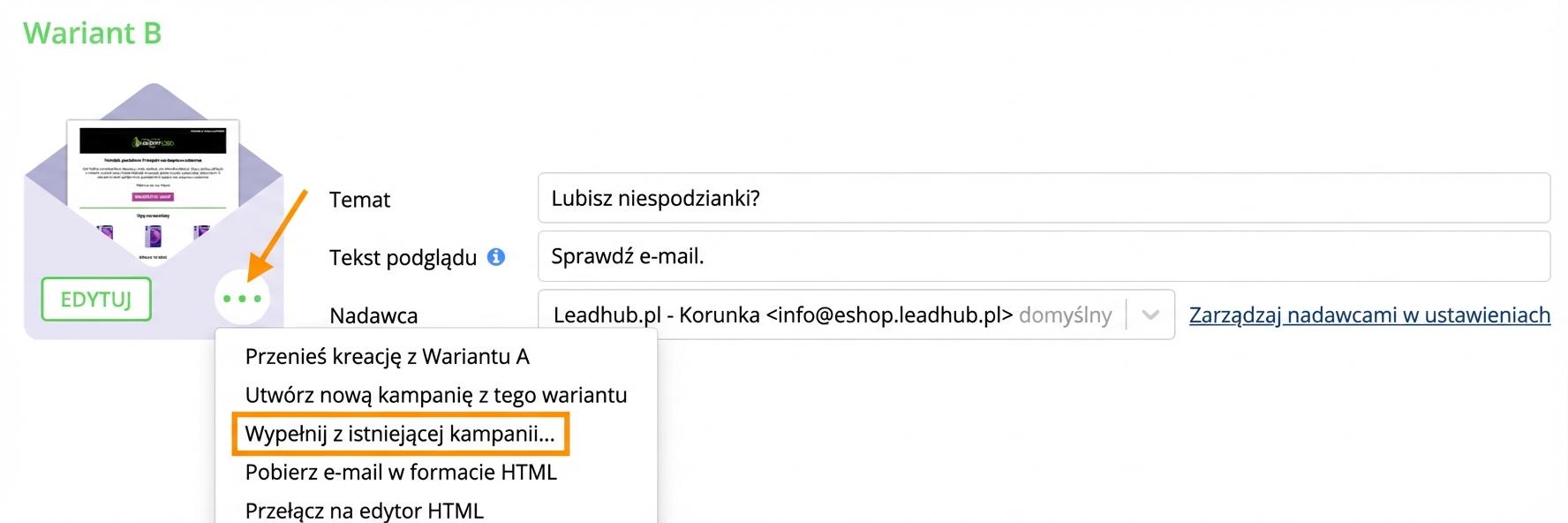 Utwórz newsletter dla wariantu A. W wariancie B wystarczy kliknąć (...) i z listy wybrać opcję "Przenieś kreację z wariantu A". Jednym kliknięciem przeniesiesz wersję e-maila z wariantu A do e-maila wariantu B.