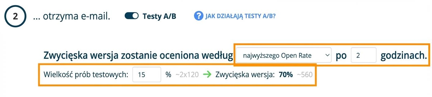Od razu wybierz, na podstawie jakiej metryki (np. najwyższy open rate) ma zostać wyłoniona zwycięska wersja testu A/B oraz po jakim czasie ma zostać wysłana pozostała część e-maili (do pozostałych 70% subskrybentów zwycięski wariant e-maila zostanie wysłany po 2 godzinach).