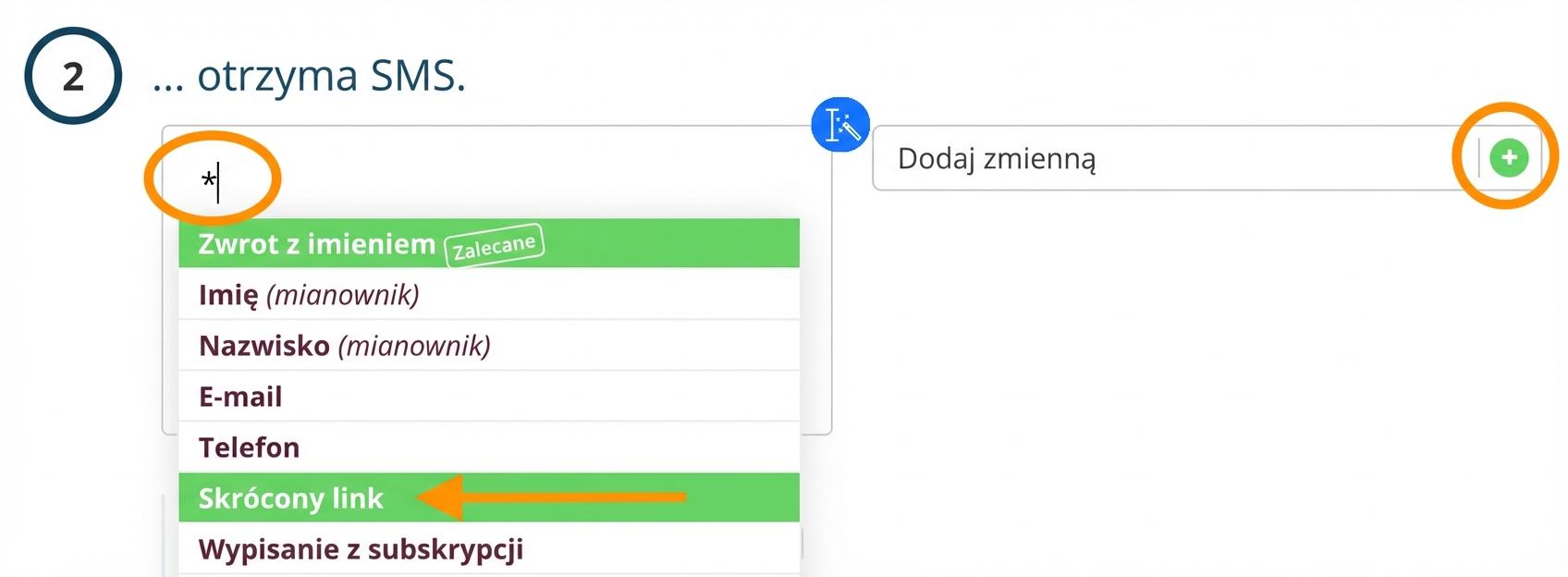 Wystarczy w treści SMS wpisać znak "*" lub kliknąć po prawej stronie edytora na "+" przy opcji "Dodaj zmienną".