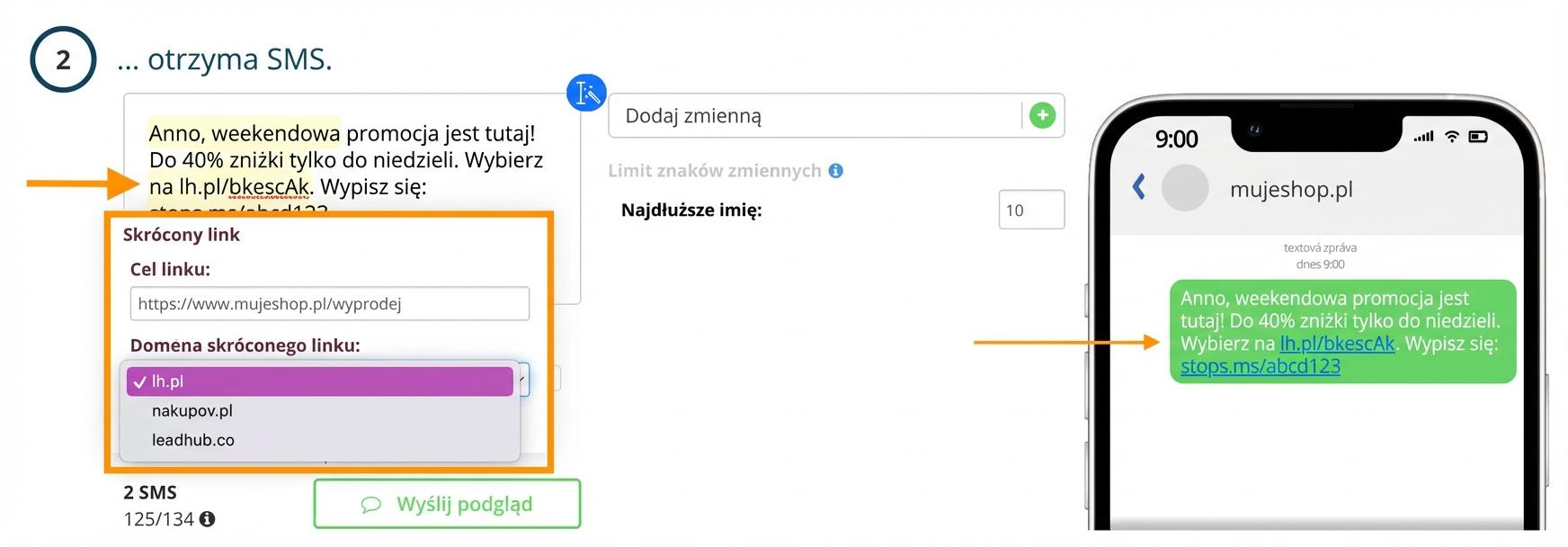 Wybierz format skróconego linku, który najbardziej Ci się podoba, i wprowadź adres URL, na który link ma kierować po kliknięciu (cel linku). Jako ostatnią opcję zawsze znajdziesz swoją domenę, którą dodasz do kampanii SMS marketing dla lepszej identyfikacji (zwłaszcza jeśli wysyłasz kampanie SMS marketing z losowego numeru telefonu i nie masz utworzonego nadawcy tekstowego).