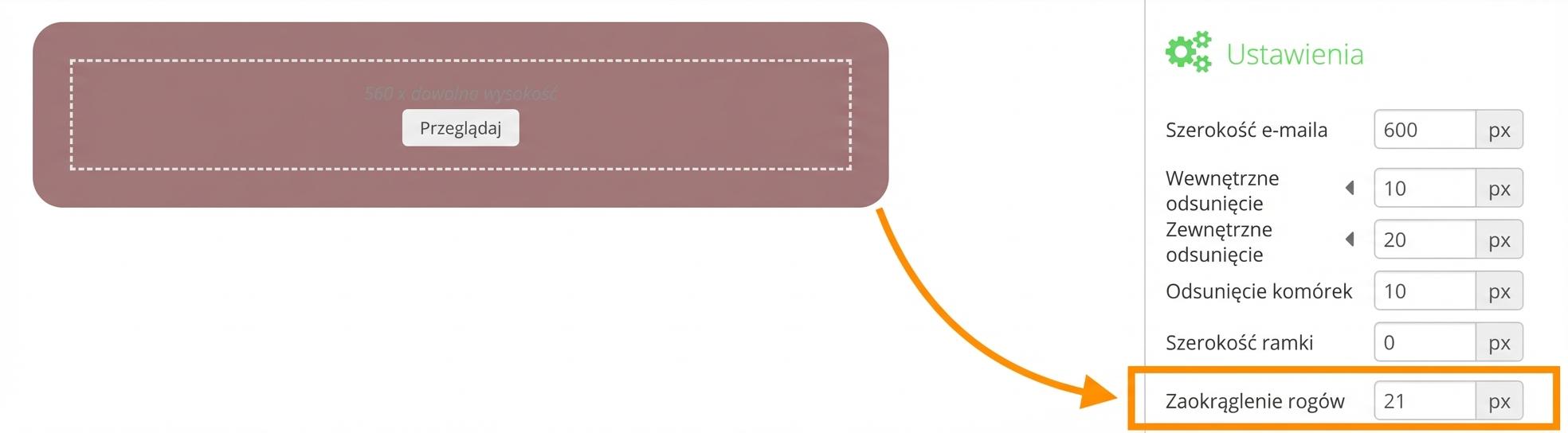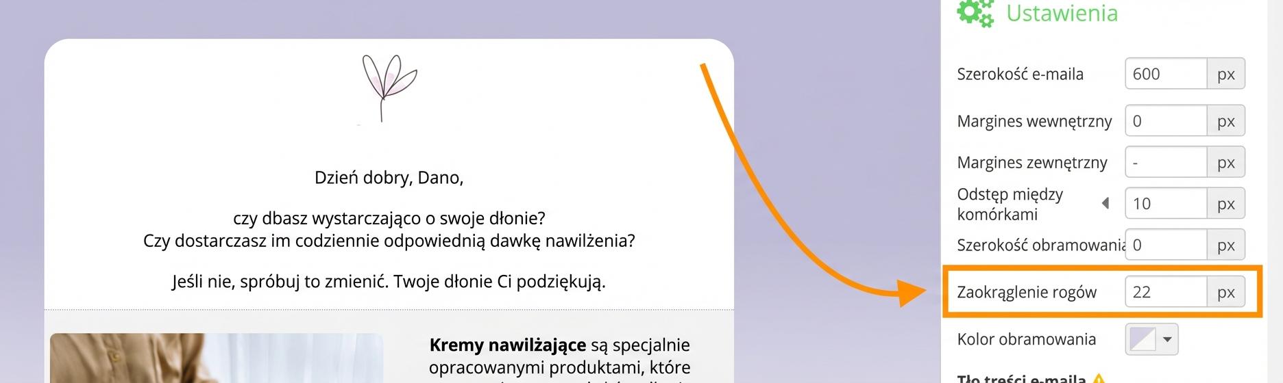 Kliknij w dowolnym miejscu poza treścią e-maila. Po prawej stronie edytora wybierz opcję "Zaokrąglenie rogów". Ustaw liczbę pikseli, a rogi automatycznie zaokrąglą się zarówno w górnej, jak i dolnej części e-maila.