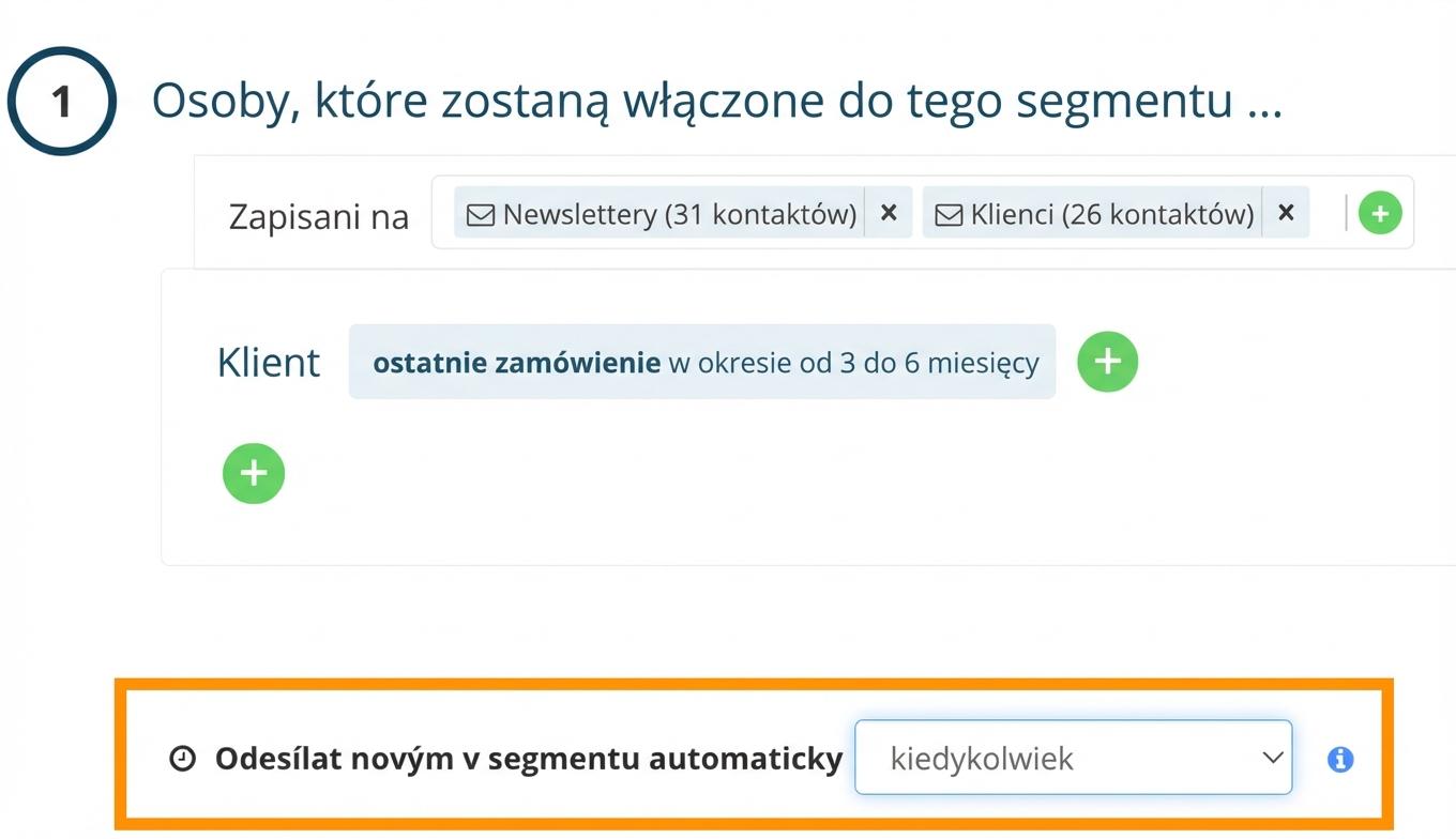 Przykład: W kampanii automatycznej masz ustawiony segment, jak w poprzednim przykładzie, że chcesz wysłać e-mail do klientów po 3 miesiącach od ich ostatniego zamówienia.