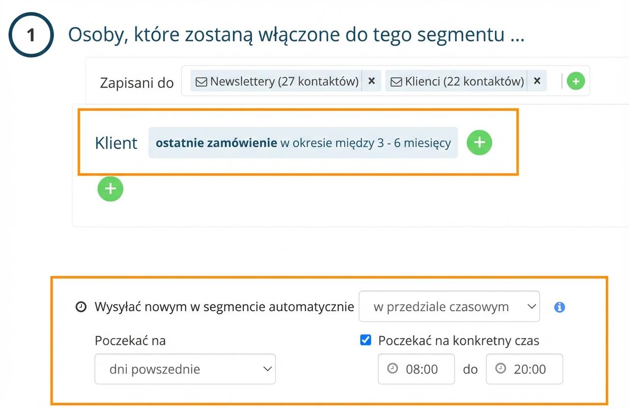 Jednak w tym momencie subskrybent musi nadal spełniać reguły Segmentacja (warunki), które są ustawione w kampanii automatycznej. W naszym przykładzie musi spełnić warunek, że od jego ostatniego zamówienia minęło więcej niż 3 miesiące, a jednocześnie mniej niż 6 miesięcy.