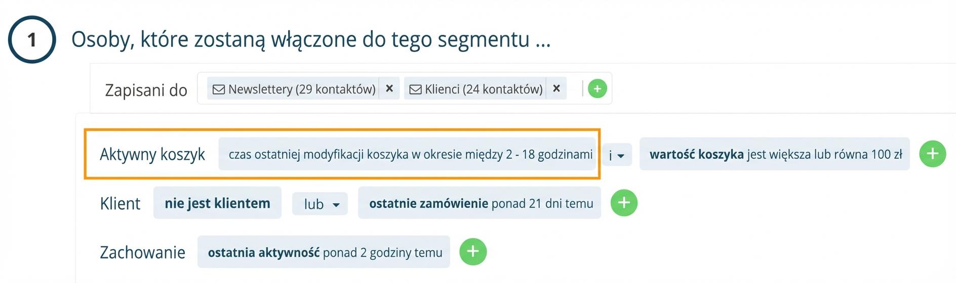 Przykład: Jeśli chcesz ustawić przedział czasowy np. dla kampanii Porzucony koszyk i wysyłać e-mail z kampanii tylko między 8:00 a 20:00, ustaw w regule „czas ostatniej modyfikacji koszyka w okresie od 2 do np. 18 godzin”. Jeśli ustawisz ten okres np. między 2 a 6 godzinami, istnieje ryzyko, że niektórym subskrybentom e-mail nie zostanie wysłany, ponieważ w przedziale czasowym nie będą już należeć do wybranego segmentu.