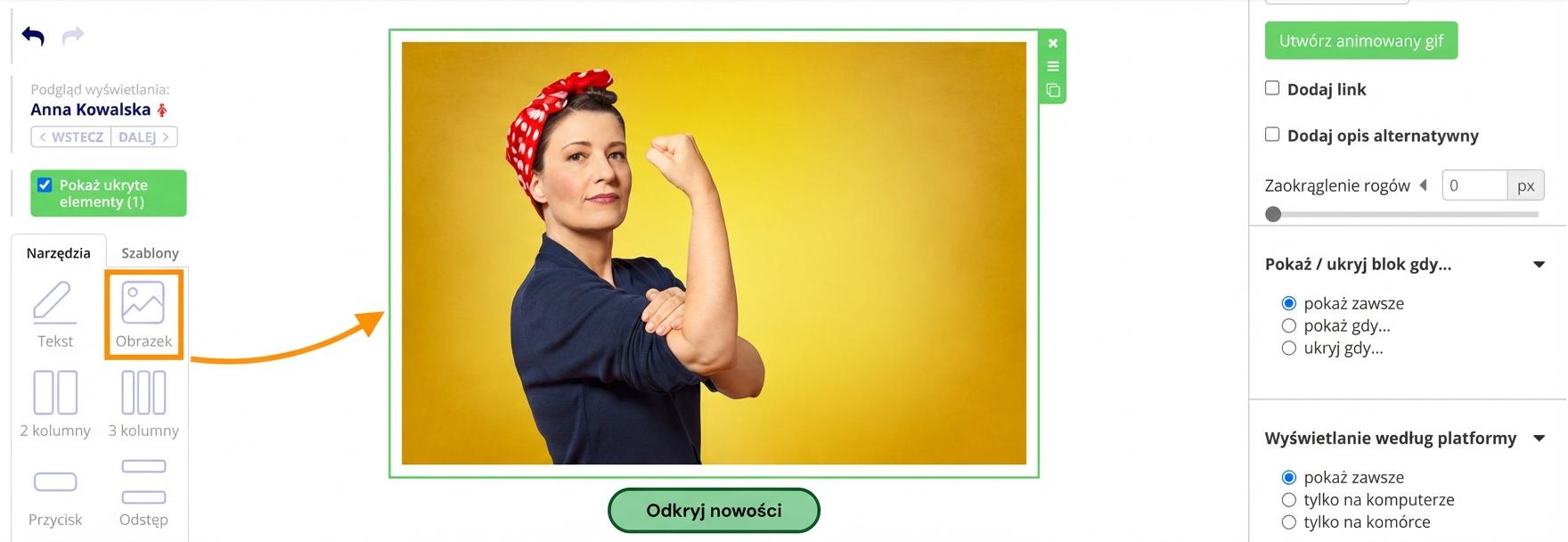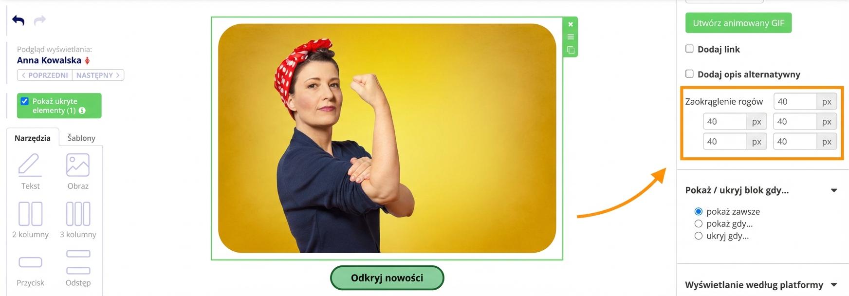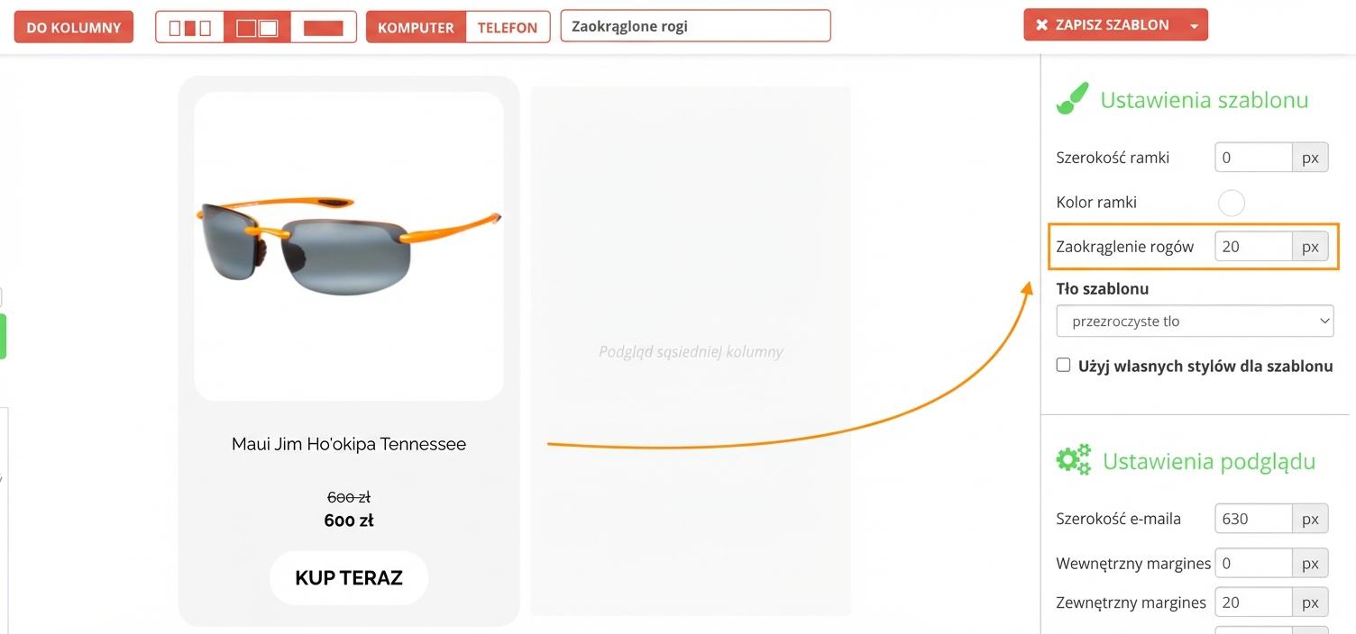Wystarczy kliknąć obiekt "obraz produktu" i w prawej części edytora ustawić zaokrąglenie rogów.