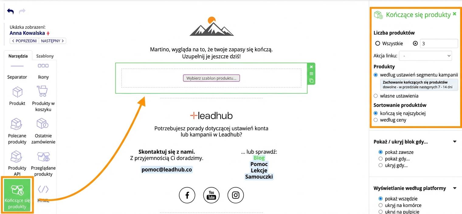 Aby w e-mailu dynamicznie wygenerowały się produkty, które kończą się u Twojego subskrybenta, wystarczy przeciągnąć do treści e-maila obiekt „Kończące się produkty”.