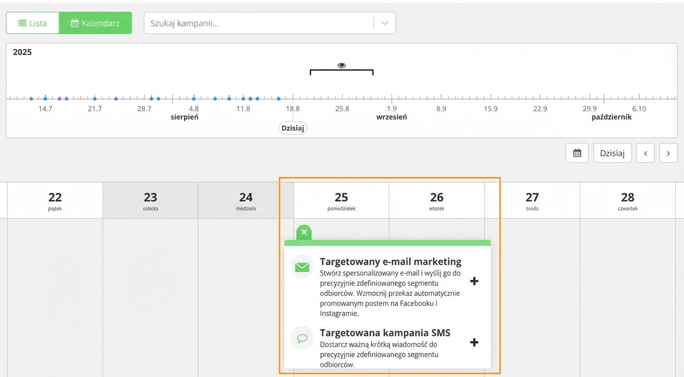 na osi czasu widzisz wysłane, przygotowywane i zaplanowane jednorazowe kampanie (newslettery, SMS)