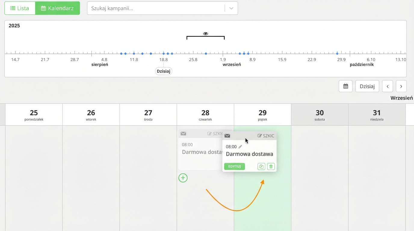 - kampanie możesz przeciągać myszą między poszczególnymi dniami