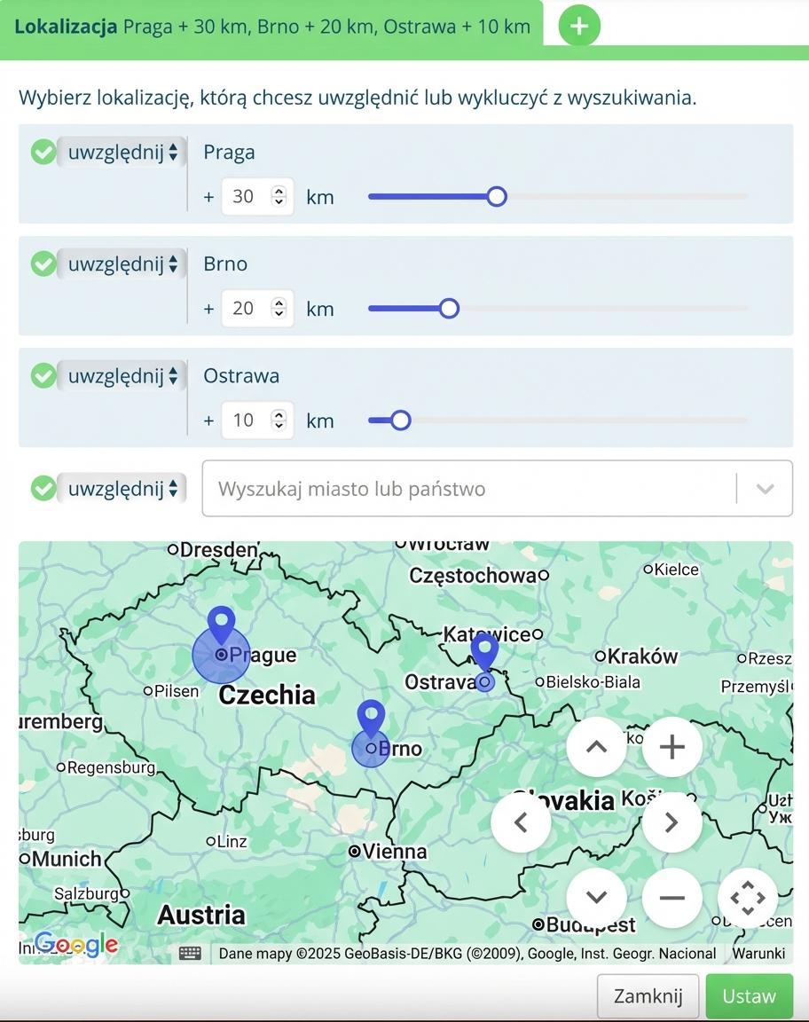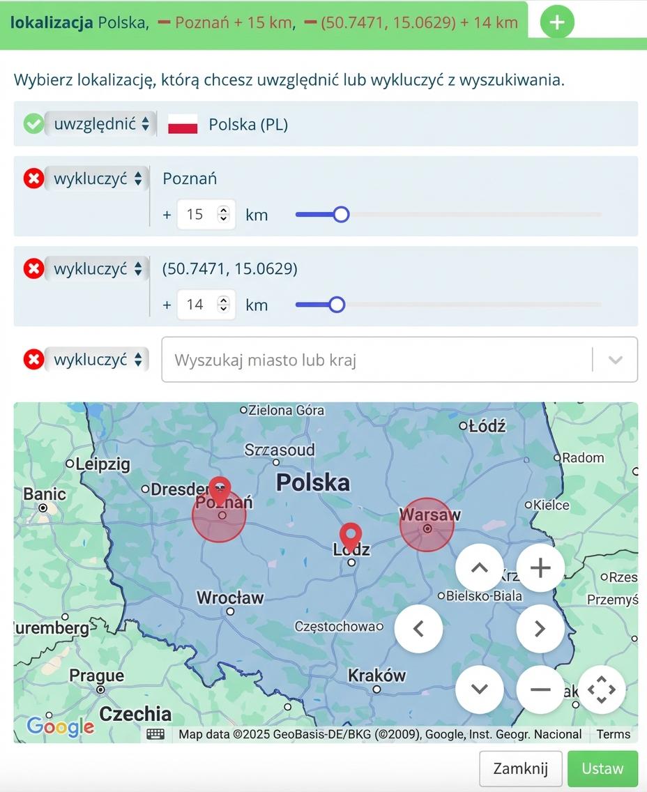 Inną możliwością jest uwzględnienie np. Czech i wykluczenie obszarów, w których masz sklep stacjonarny, albo z jakiegoś powodu nie chcesz kontaktować się z tymi kontaktami na wybranym obszarze.