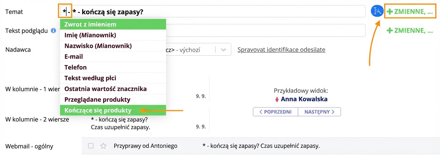 Jak wstawić nazwę kończącego się produktu do tematu lub treści e-maila