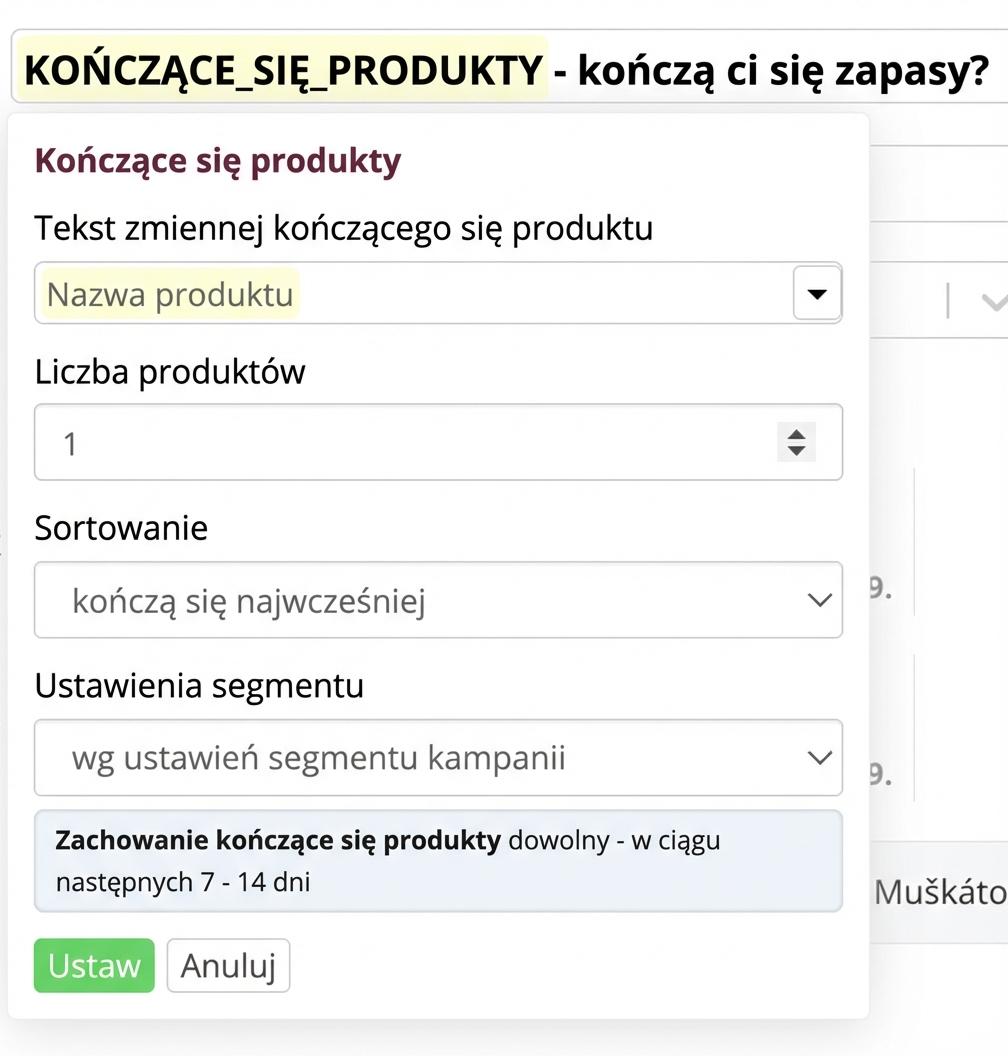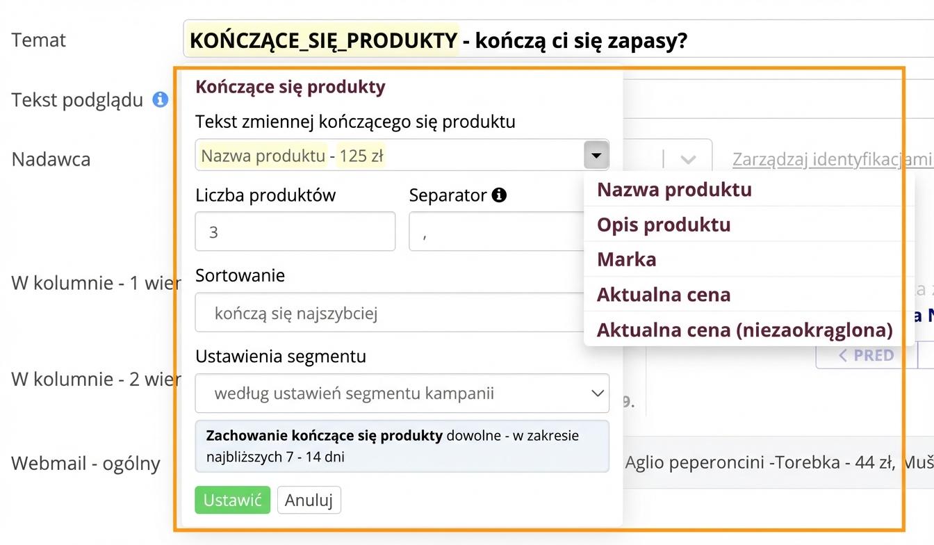 Liczba produktów – określa, dla ilu produktów w temacie kampanii zostaną wygenerowane zmienne, które wpisałeś w pierwszym polu