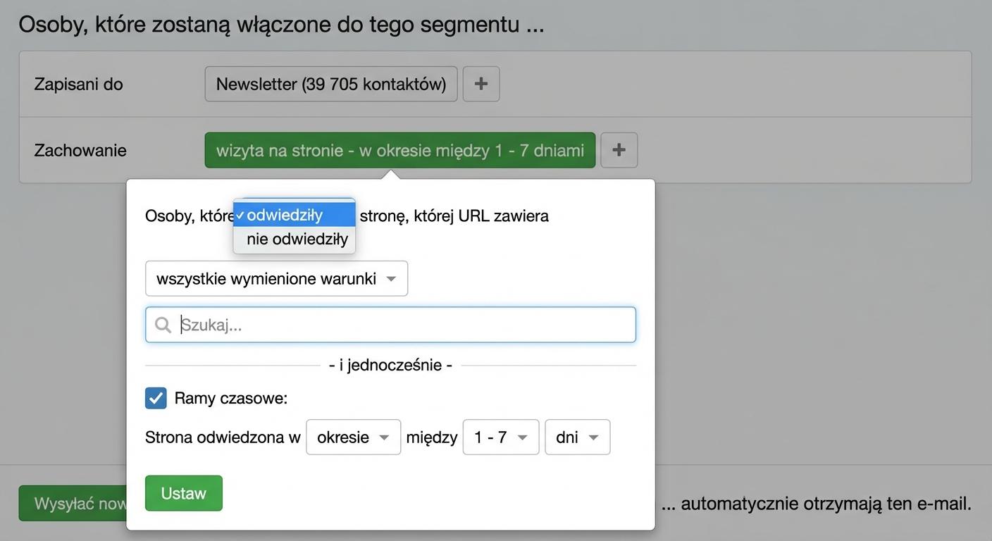 - wybierz okres czasu, w którym strona została odwiedzona (na jego podstawie będzie też wysyłany automatyczny e-mail z kampanii, jeśli nie zostaną wybrane żadne inne reguły segmentacji)
