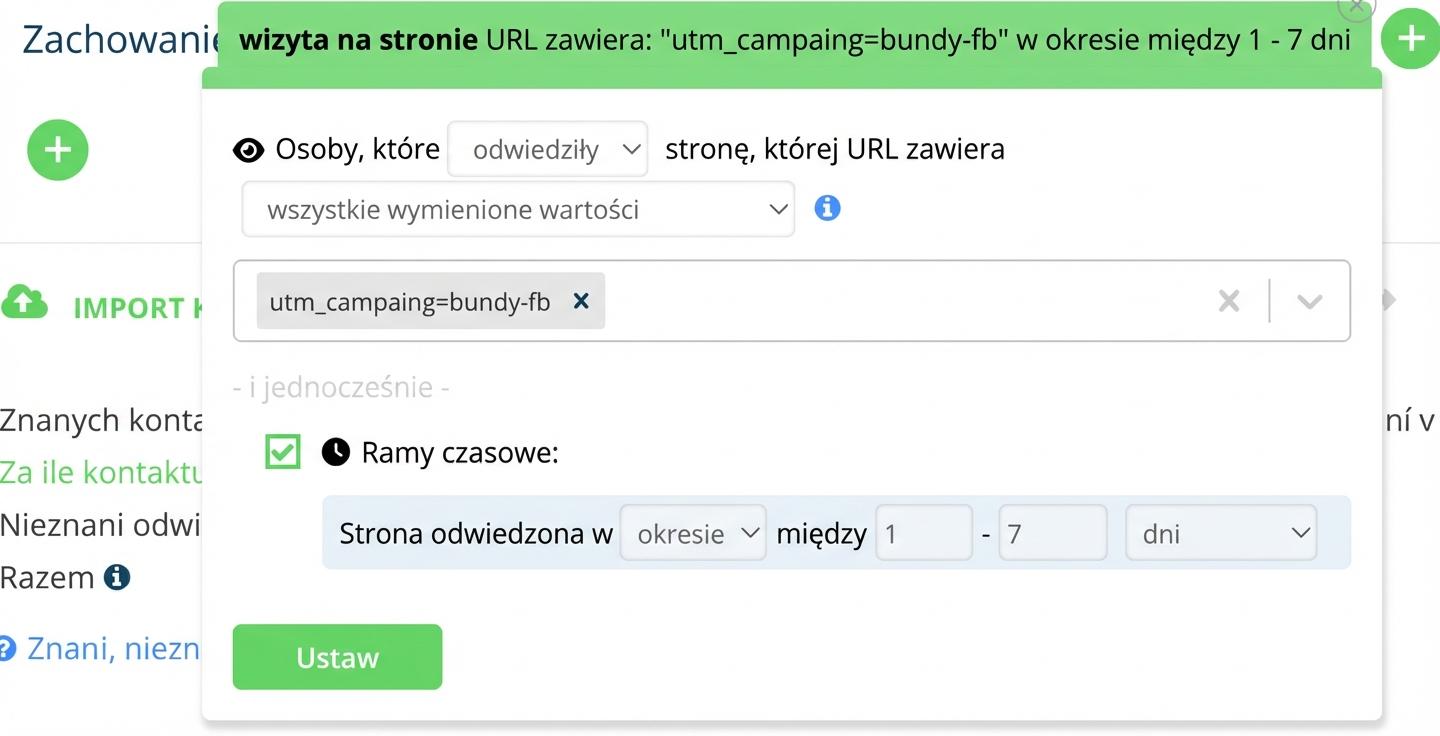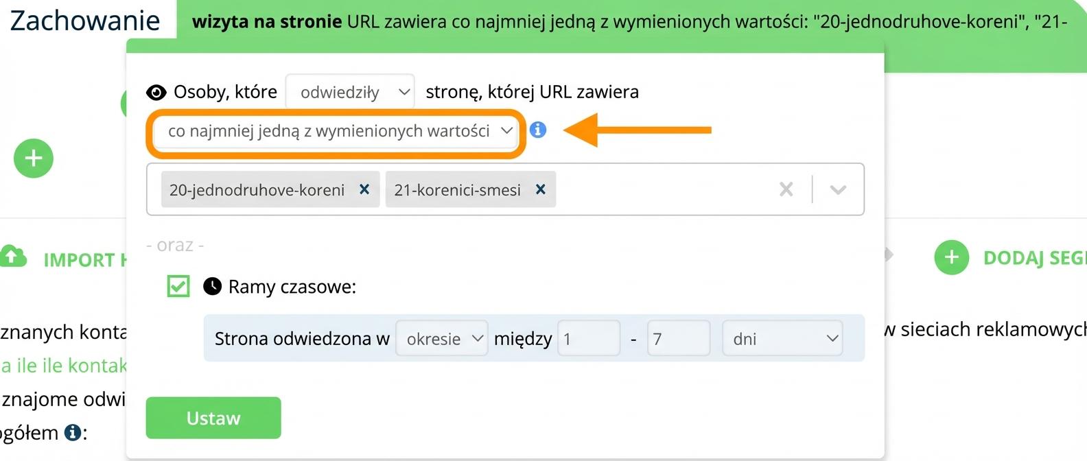 Podczas tworzenia grupy odbiorców możesz następnie wybrać, czy chcesz uwzględnić wszystkie kontakty, które odwiedziły co najmniej jedną z podanych stron / parametrów UTM, czy przeciwnie — tylko te kontakty, które w przeszłości odwiedziły wszystkie wymienione strony / parametry UTM.