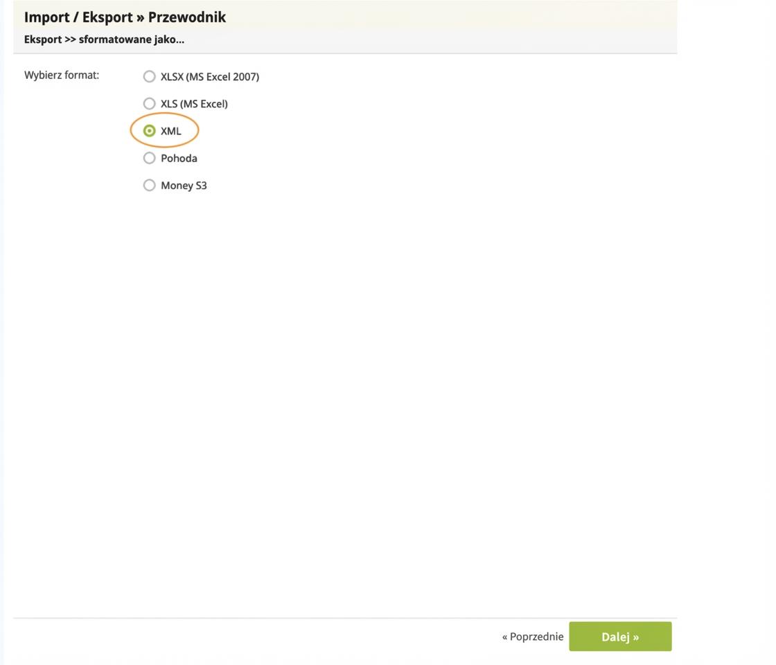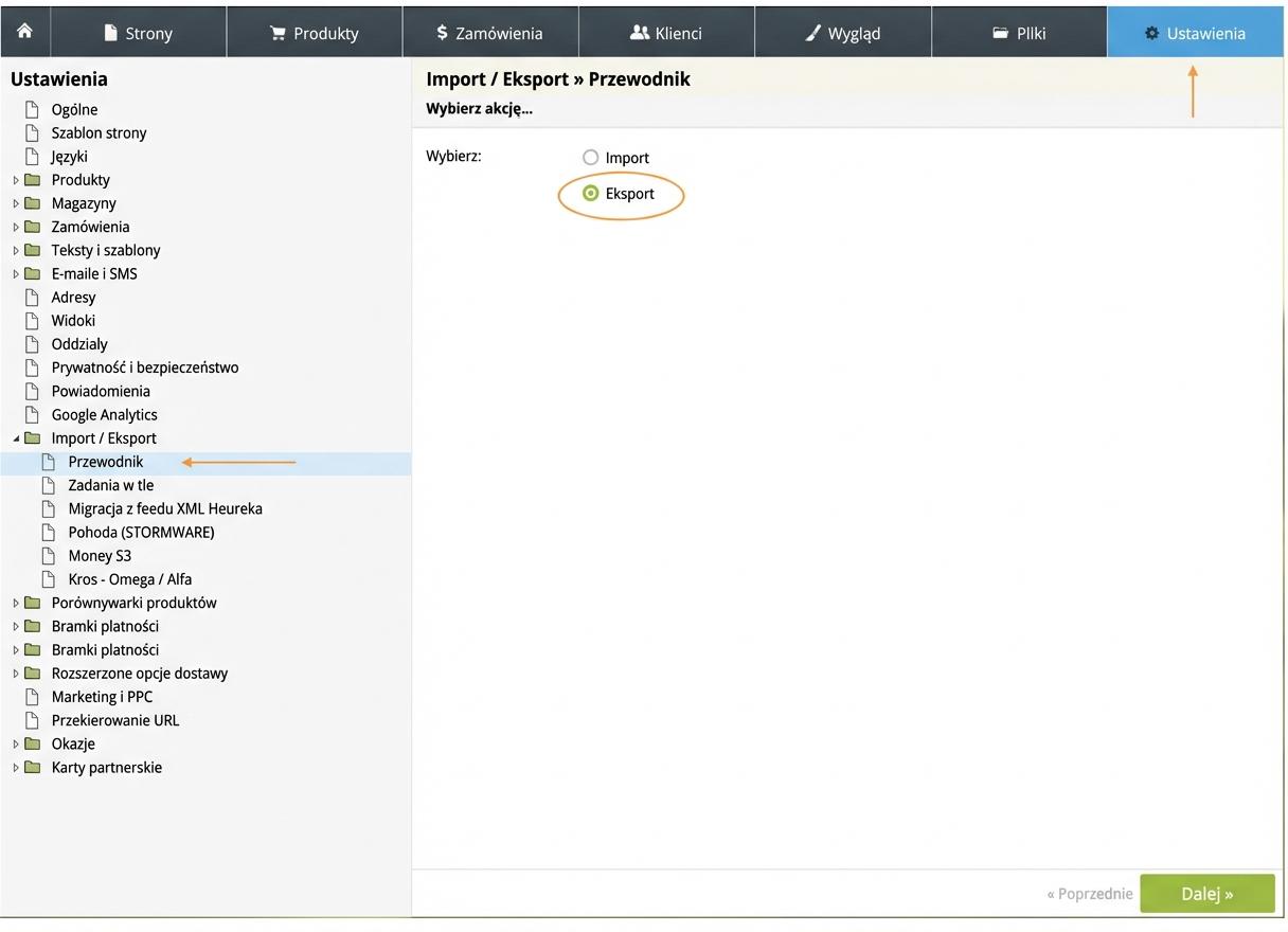 - W panelu administracyjnym swojego e-sklepu przejdź do zakładki „Ustawienia → Import/Export → Kreator”. Wybierz „Eksport” i kliknij przycisk „Dalej”. Z dostępnych formatów wybierz XML i kliknij przycisk „Dalej”.