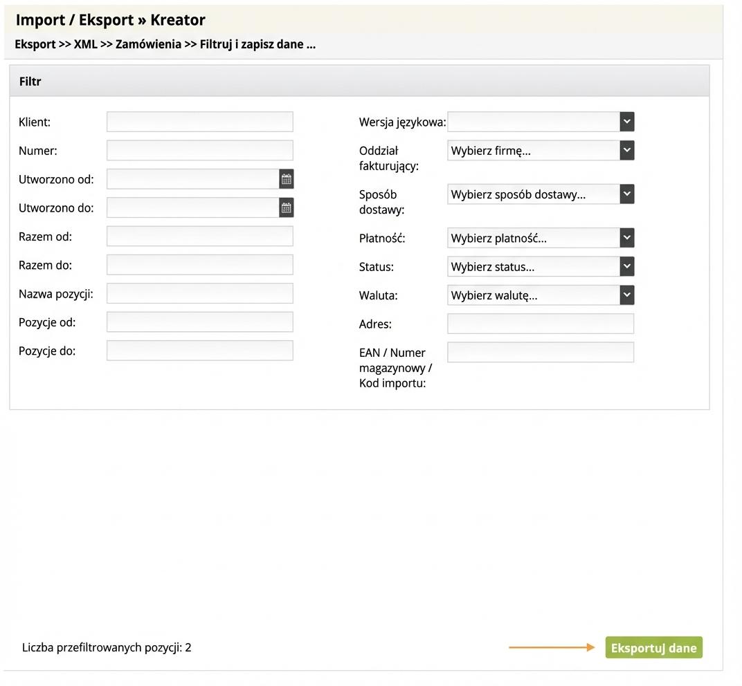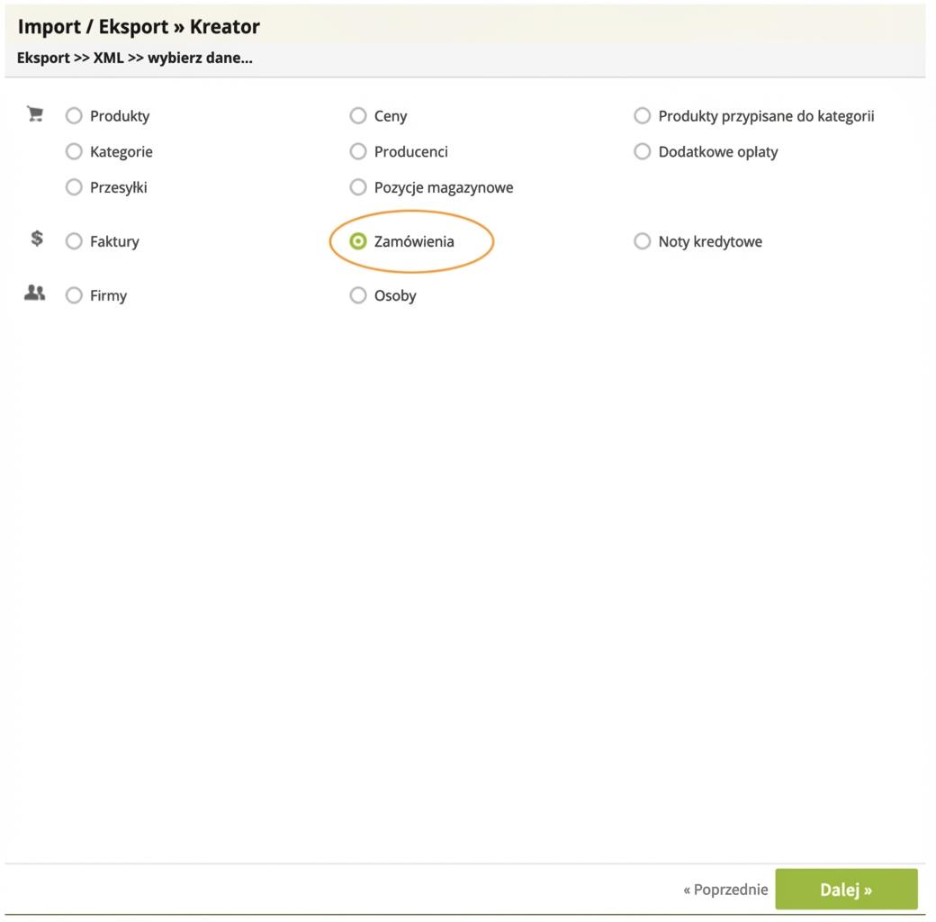 - Z dostępnych opcji zaznacz „Zamówienia” i kliknij przycisk „Dalej”. Na ekranie filtrów wybierz właściwą wersję językową, a następnie możesz kliknąć przycisk Eksportuj dane.
